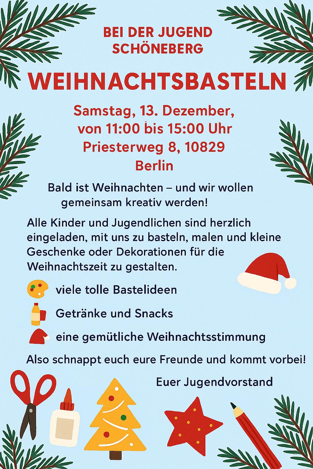 Alle Kinder und Jugendliche sind herzlich eingeladen, mit uns zu basteln, zu malen und kleine Geschenke oder Dekorationen für die Weihnachtszeit zu gestalten.