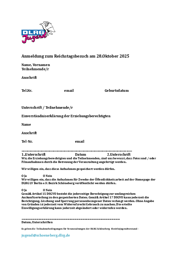 Bitte schickt das ausgefüllte Anmeldeformular per E-Mail an jugend@schoeneberg.dlrg.de