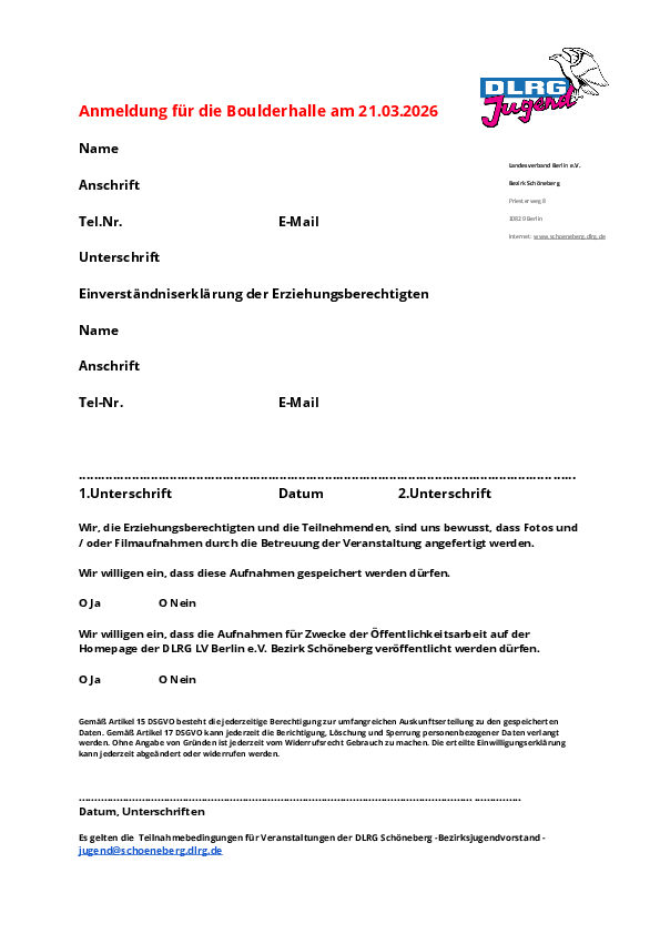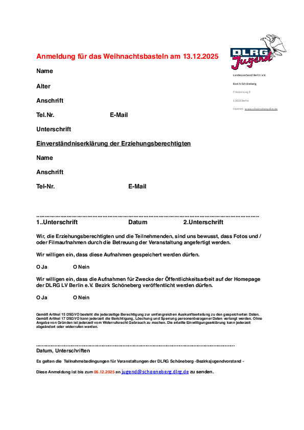 Bitte schickt das ausgefüllte Anmeldeformular per E-Mail an jugend@schoeneberg.dlrg.de